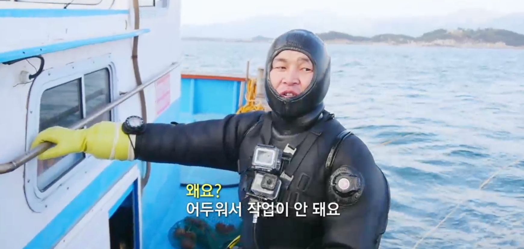 마지막으로 소개할 건강식은 바로 바다의 제왕 문어입니다. 바다 날씨는 특히나 변화가 잦고, 예측하기 어렵기 때문에, 위험이 도사리고 있어서 작업을 하는 사람 입장에서는 긴장의 끈을 놓을 수가 없습니다. 온몸으로 바다와 맞서는 작업자들은 절대 무리하지 않는 선에, 산소 호흡기 장치를 꼼꼼히 체크하여, 바닷속으로 몸을 던집니다.