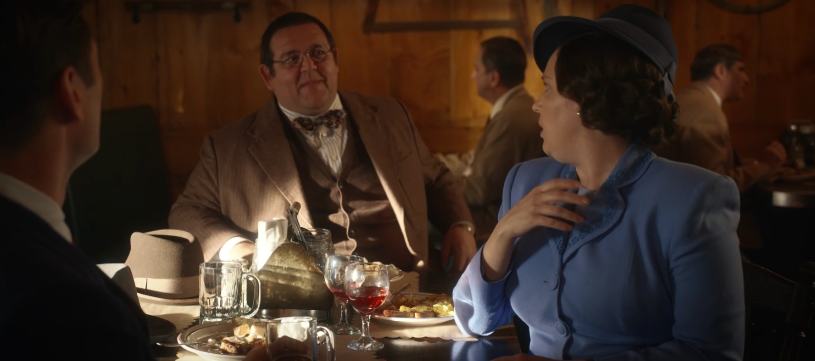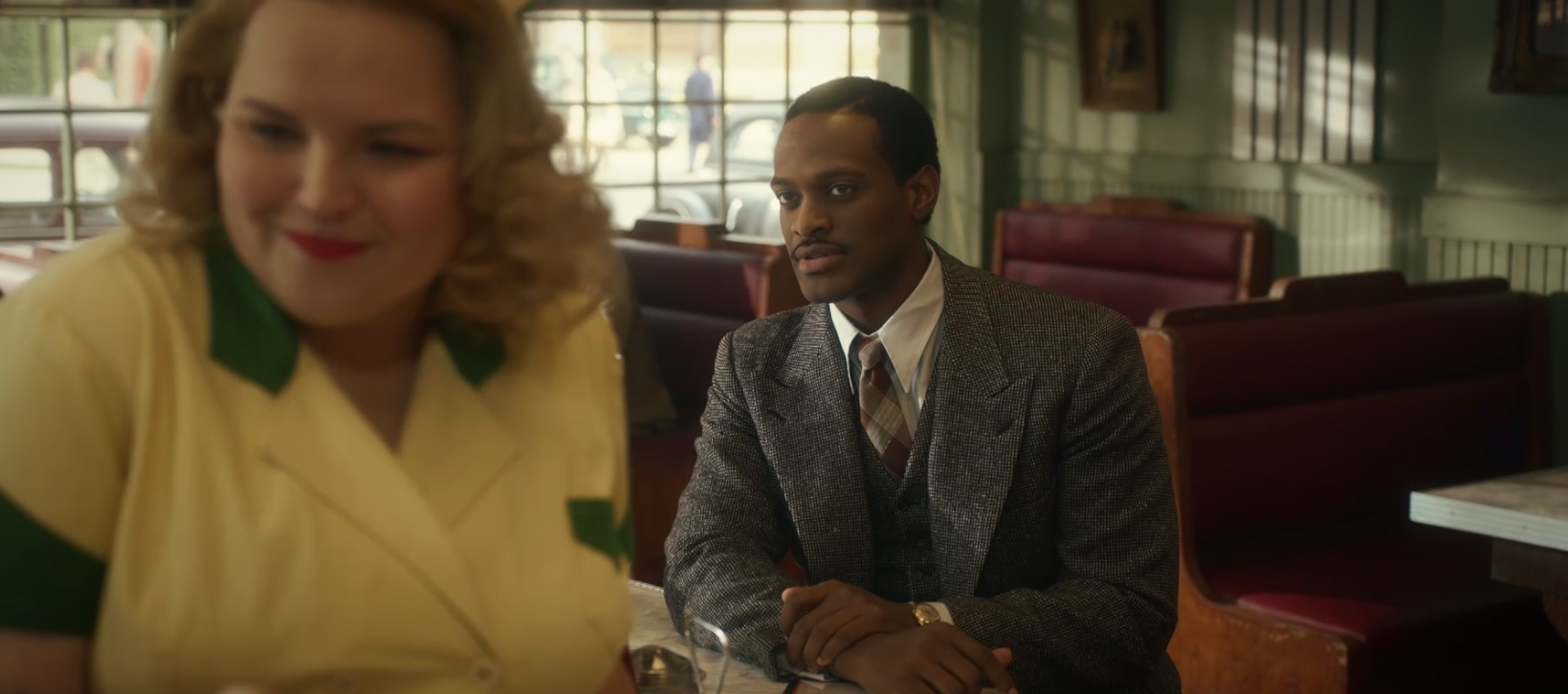 세상에나.... 이때 카페 안에서 학창 시절 진하게 썸 타던 '톰 매디슨'을 만나게 되었다. 너무나 멋진 모습의 그를 보며 입이 다물어지지 않는 알마. 톰도 알마의 슈트 차림이 멋지다며 칭찬한다. 죽은 요스트 부인의 옷으로 치장한 것인 줄 상상도 못 하겠지만... 멋지게 차려입은 알마와 그녀의 곁에 더 멋져 보이는 남성이 앉아 웃고 떠드는 광경을 본 버트럼의 표정이 가관이 아니다. 세탁소를 6개나 운영 중이라는 톰은 학창 시절부터 인기남에  과거 이력이 아주 화려하다.