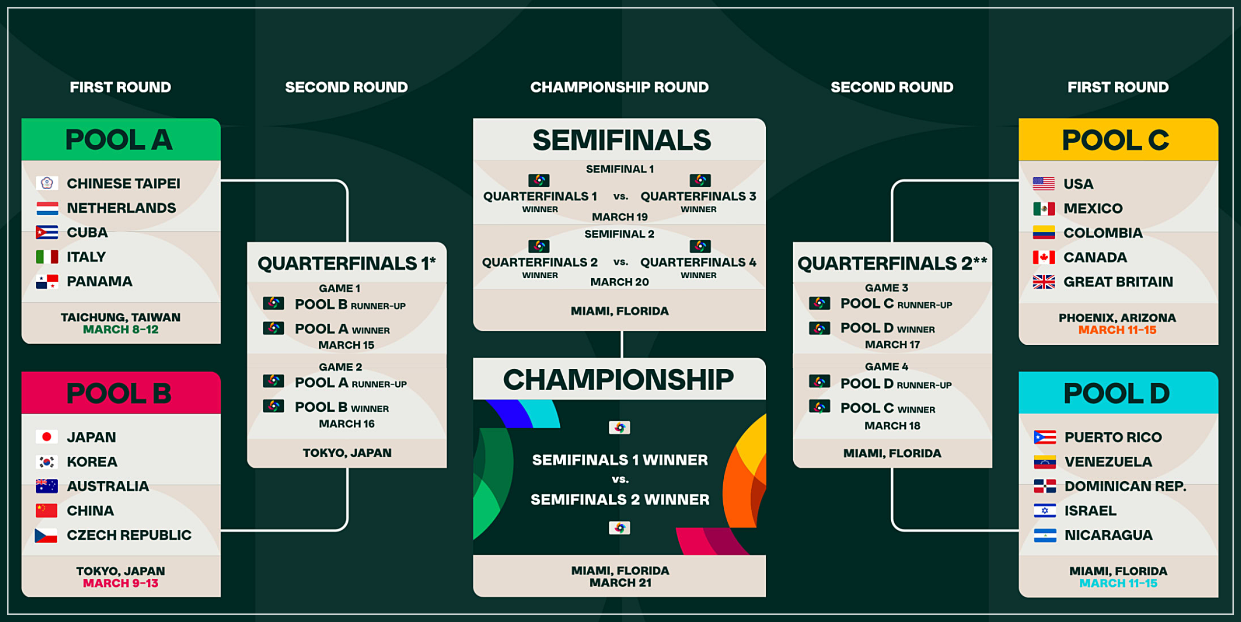 아래 사진은 WBC 홈페이지에서 발췌한 토너먼트 대진표 입니다. 대만에서 펼쳐지는 A조의 경기는 3월 8일 ~ 12일까지입니다. 미국 애리조나에서 펼쳐지는 C조의 경기는 3월 11일 ~ 15일까지 진행되며, 미국 플로리다 주에서 펼쳐지는 D조는 마찬가지로 11일 ~ 15일까지입니다.