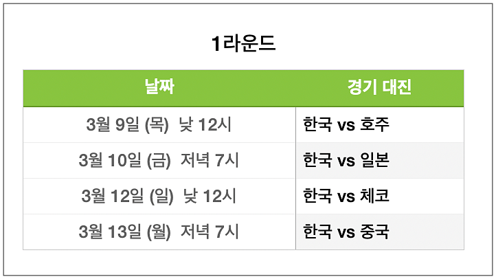 B조에 소속되어 있는 우리나라의 첫 경기는 3월 9일부터 시작하여 1라운드 경기는 13일까지 펼쳐집니다. 한 개의 조에 5개국이 참가하여, 참가국과 각각 총 4번의 경기를 치릅니다.